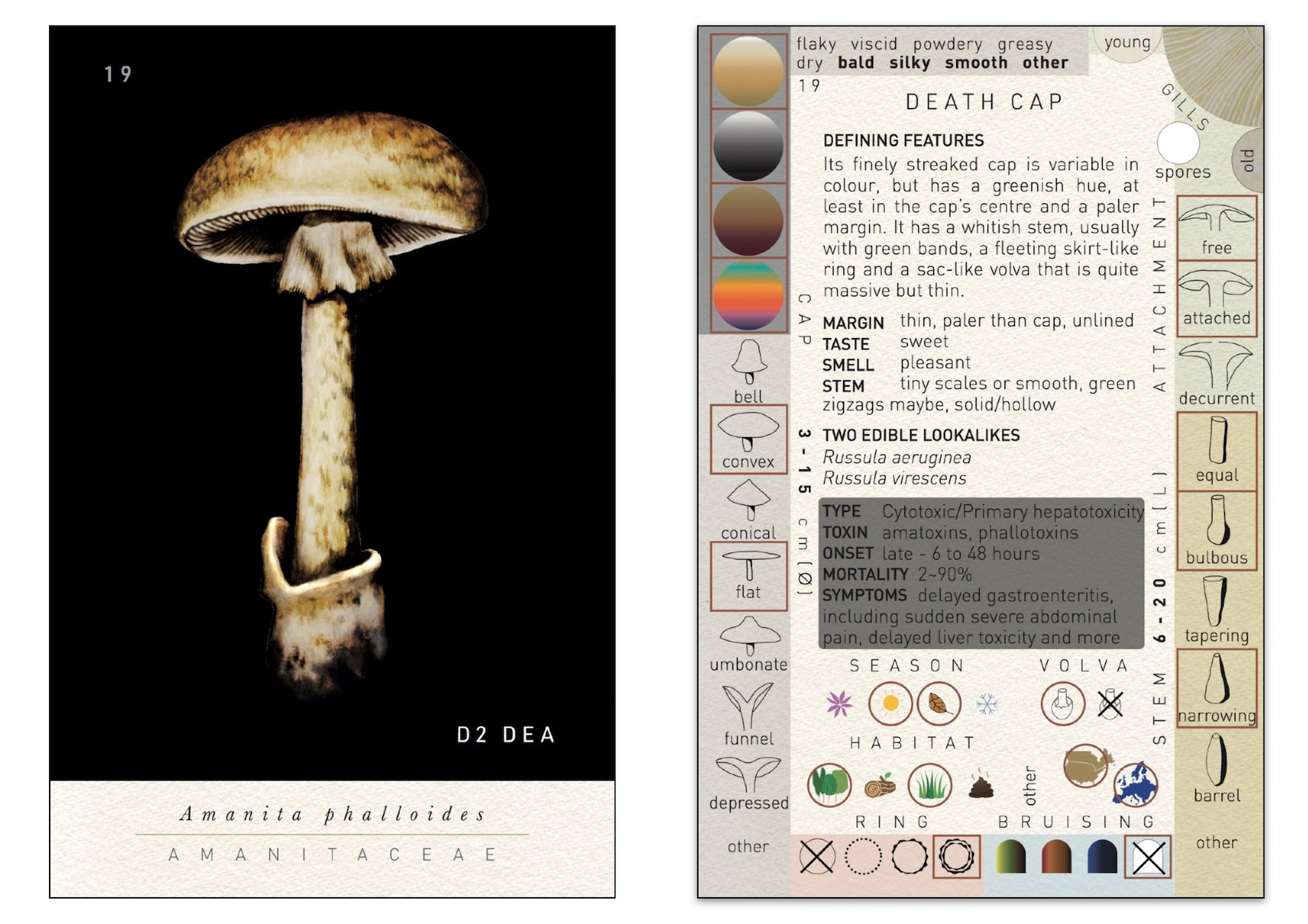 A new method of identification Deck 2: The Deadlies is the second in a series of four. The method moves away from using the image of the mushroom. Instead, this tool encourages the user to explore the mushroom through its less obvious characteristics, and in so doing, helps the user "see" the mushroom in a different more profound light.